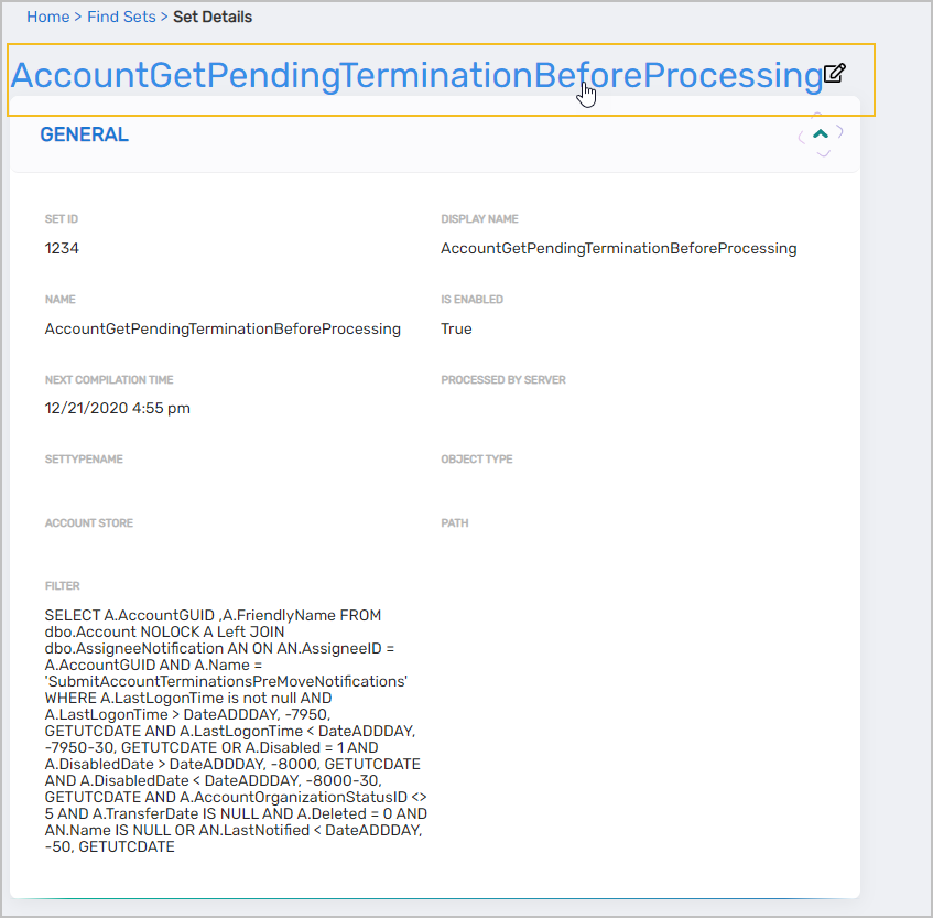 If the Filter meets your requirements for classifying an account as stale, return to the Find SetGroup page and follow the above steps to review the Set filters for the AccountGetPendingTerminationNotProcessed and the AccountGetPendingTerminationProcessed Sets; otherwise, click the Edit link for the Set as shown in the below image, edit the query as needed and then review the other Sets.