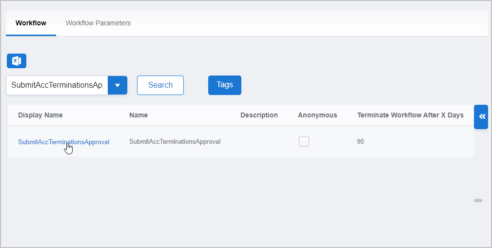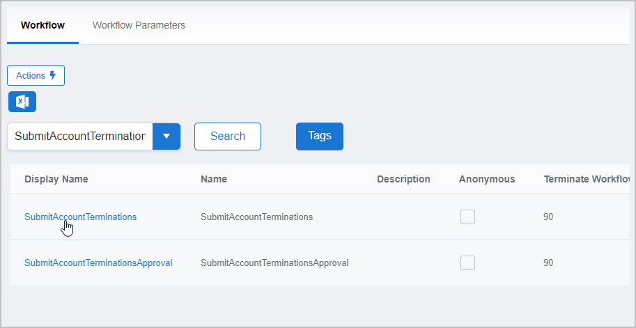 On the Workflows page, search for SubmitAccTerminationsApproval and then click the Display Name link for the workflow.