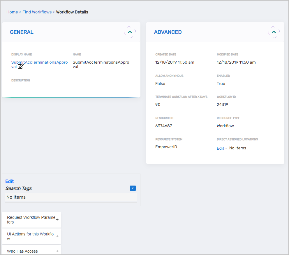 - Click the Find Workflows breadcrumb at the top of the page and then search for search for TerminateAccountAdvanced.