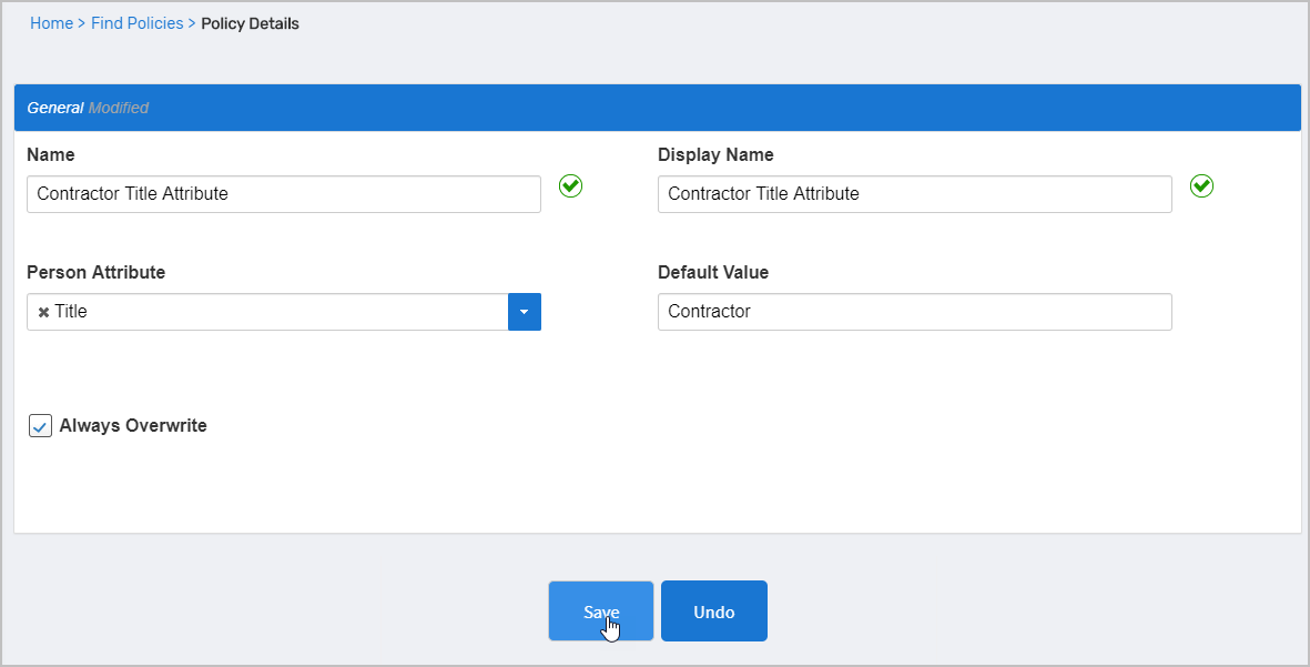 Always Overwrite – Select (check) whether changes occurring to the attribute in the external system should be reverted back to the default value set by the policy.