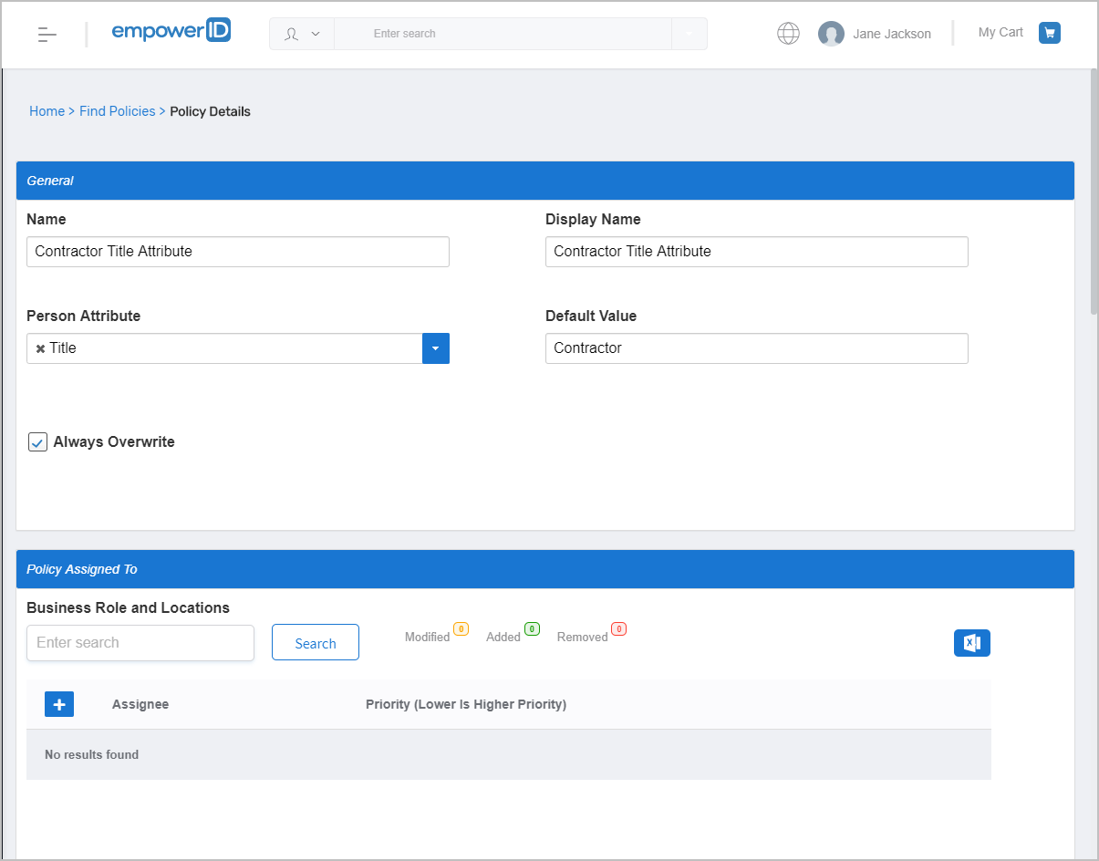 After EmpowerID creates the policy, you should be directed to the completed Policy Details page. You can assign the policy to any EmpowerID Actor from this page, such as a Group or Business Role and Location.