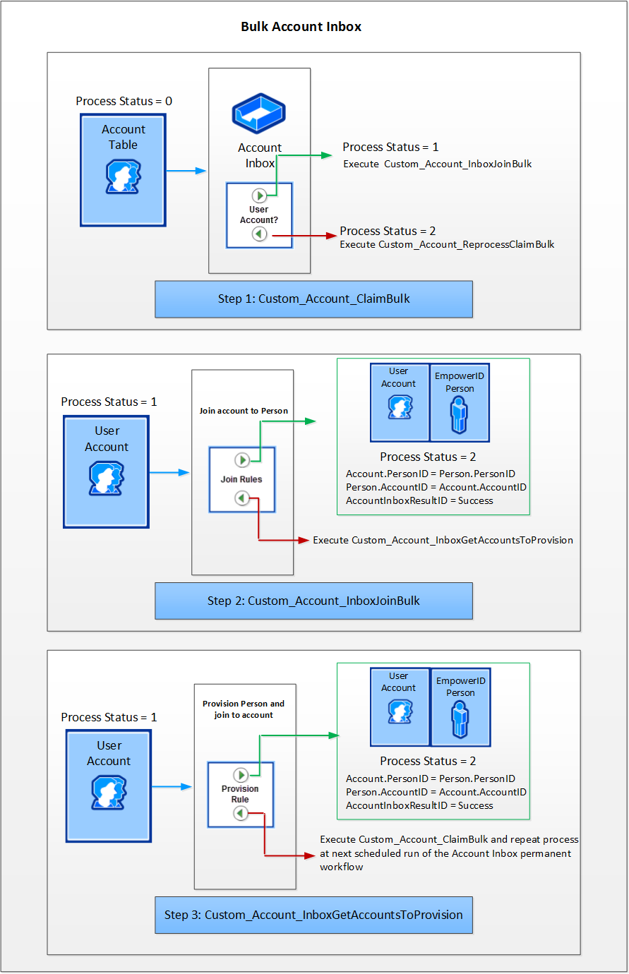 The Bulk Account Inbox is a permanent workflow that, when enabled, runs in a continuous loop (once every 10 minutes), claiming and processing all previously unprocessed accounts in the Account table of the EmpowerID metadirectory. The processing flow for this workflow is as follows: