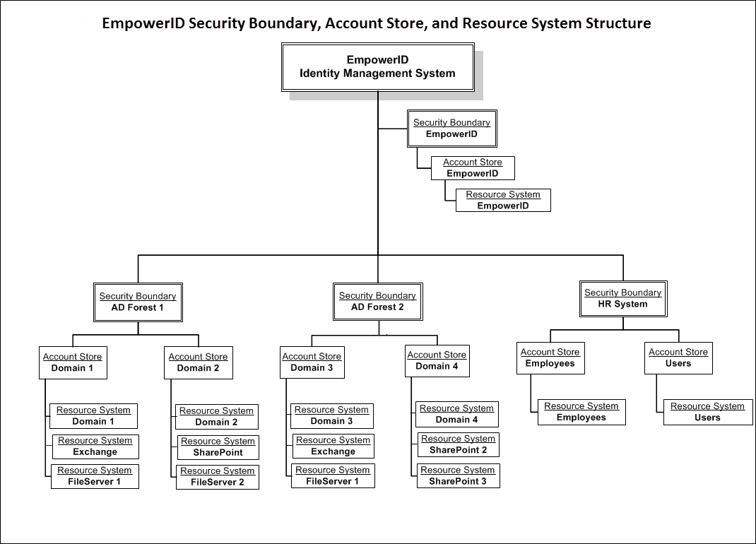 In EmpowerID, account stores and any resource systems associated with those account stores belong to a "Security Boundary," which is the EmpowerID equivalent to an Active Directory forest. Security Boundaries provide the specific identity and authentication framework for account stores and resource systems and allow users with accounts in one account store to be granted access to resources in another account store, as long as those account stores belong to the same Security Boundary or have a trust relationship with account stores in another Security Boundary. The below image shows this relationship. In the image, EmpowerID provides umbrella protection for four different security boundaries. Two are AD forests, one is an HR System, and the other is the EmpowerID system itself. Based on the configuration of trust relationships, communication can flow from one Security Boundary to another via the EmpowerID Security Boundary, which has an implicit trust relationship with all other Security Boundaries.