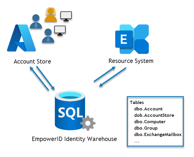 The image below shows the relationship between the EmpowerID Identity Warehouse and the resource systems to which EmpowerID is connected. Each inventoried object in a connected resource system is added to an Identity Warehouse table that corresponds to the object's resource type. In this way, inventoried user accounts are always added as records to the Account table, inventoried Account Store (Domain) objects are always added as records to the AccountStore table, and inventoried mailboxes are always added as records to the ExchangeMailbox table, and so on.