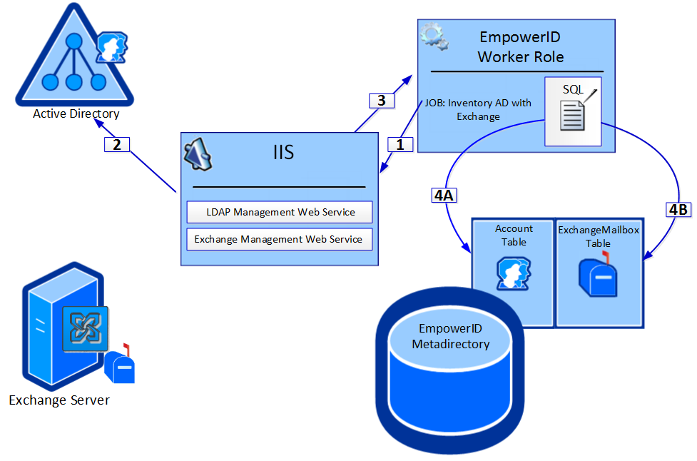 The EmpowerID Worker Role schedules and dispatches the Inventory Job for each connected account store, based on the user-defined settings for that schedule and account store. When the scheduled time arrives, the EmpowerID Worker Role instructs the Inventory Job to execute the Inventory method for the account store in question. In the case of an Active Directory account store with an Exchange resource system, the Inventory Job responds by looking for the LDAP Management Web Service in IIS. Once the Job has reached the LDAP Management Web Service, the service makes an LDAP call to the Active Directory account store, retrieving each new user account discovered in the account store (step 2 below). The LDAP Management Web Service then returns that information to the EmpowerID Worker Role (step 3 below), which processes the accounts, writing each one as a record to the Account table of the Identity Warehouse (step 4a below). Simultaneously, the Worker Role creates mailbox objects for each account discovered to have a mailbox and writes those objects to the ExchangeMailbox table (step 4b below). Once this initial inventory is complete, the process repeats itself, discovering any new accounts added to the account store and adding them to the appropriate Identity Warehouse tables in accordance with the inventory schedule.