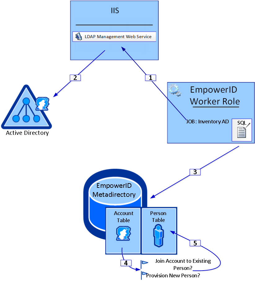 Once these objects have been added to the Identity Warehouse, populating the tables of the EmpowerID Identity Warehouse with resource objects like accounts, mailboxes, and groups is handled by specific EmpowerID Windows services and the processes or "EmpowerID Jobs" hosted by those services. For account stores like Active Directory, the relevant services and jobs are the EmpowerID Worker Role Windows service, the Inventory Job hosted by the EmpowerID Worker Role, and the LDAP Management Web Service hosted by IIS.