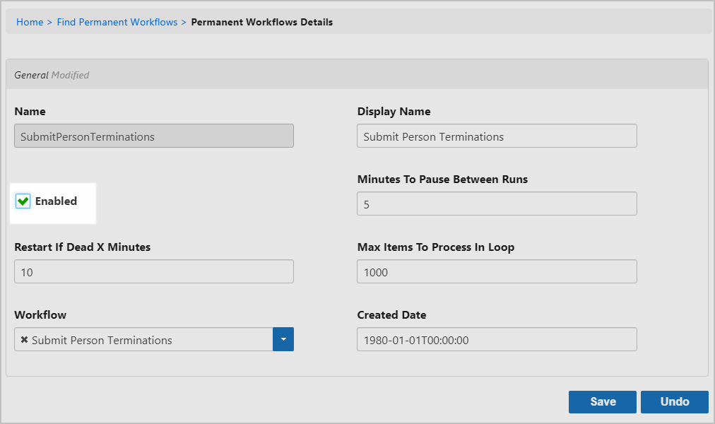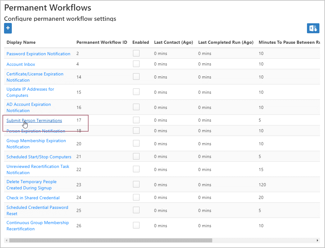 - Enabling the SubmitPersonTerminations permanent workflow – When enabled, this workflow runs in a continuous loop, executing once every five minutes to terminate all people with a ValidUntil expiration that has passed the number of days specified by the PersonTerminationGracePeriod system setting.