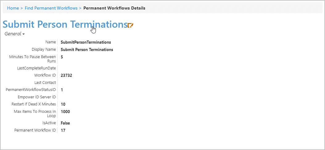 - On the Permanent Workflows page, click the Submit Person Terminations link to open the Details page for the workflow.