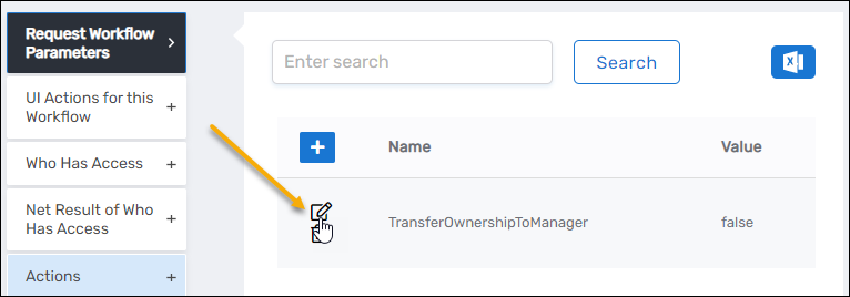 - Expand the Request Workflow Parameters accordion and click the Edit icon on the TransferOwnershipToManager parameter.