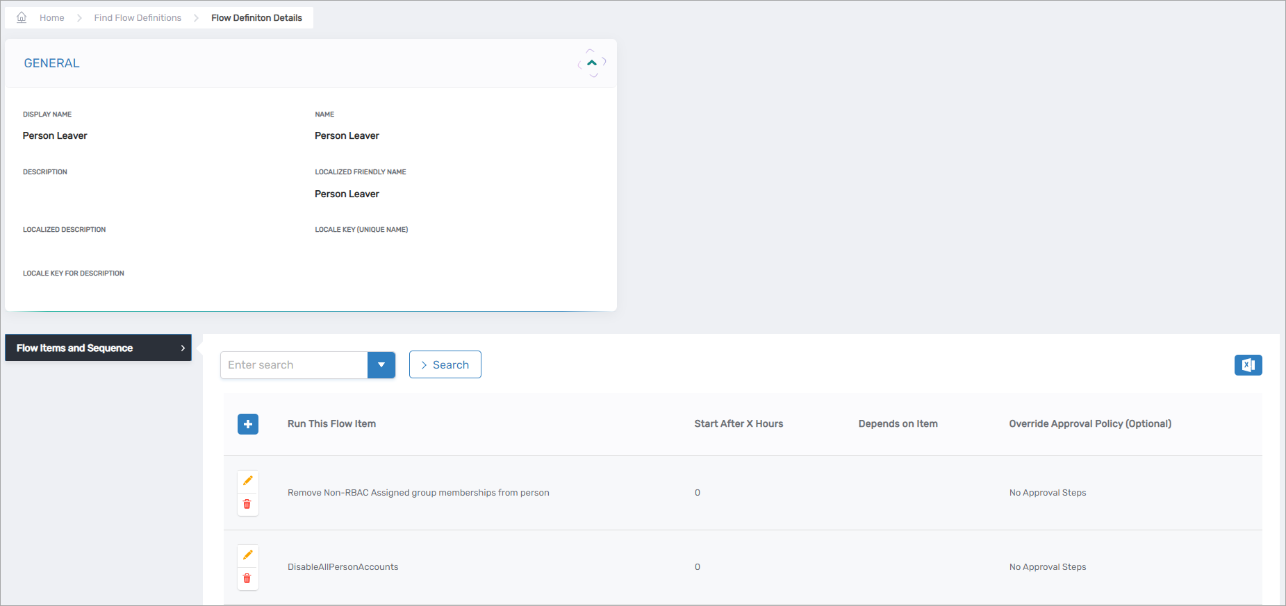 Flow Items are the specific tasks or actions to be performed in response to Flow Events. Each is designed to handle a particular facet of the event response. For example, if a Person Leaver event is detected, Flow Items could include actions like "Remove this person from all groups" and "Disable all accounts belonging to this person."