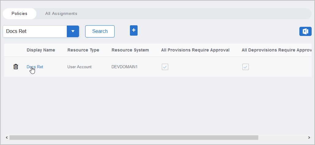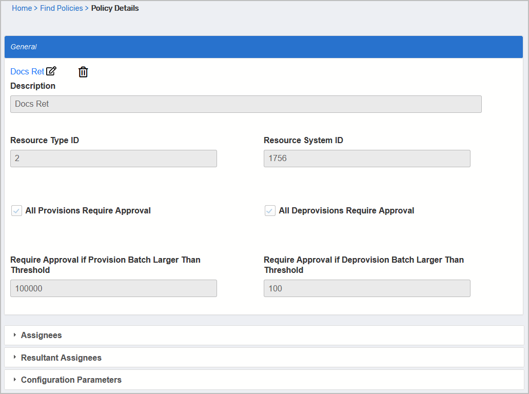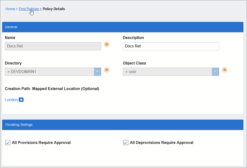 - All Deprovisions Require Approval – If this option is selected, the deprovisioning of each RET specified by the policy will need to be approved by a user delegated access to the Resource Entitlement Inbox.