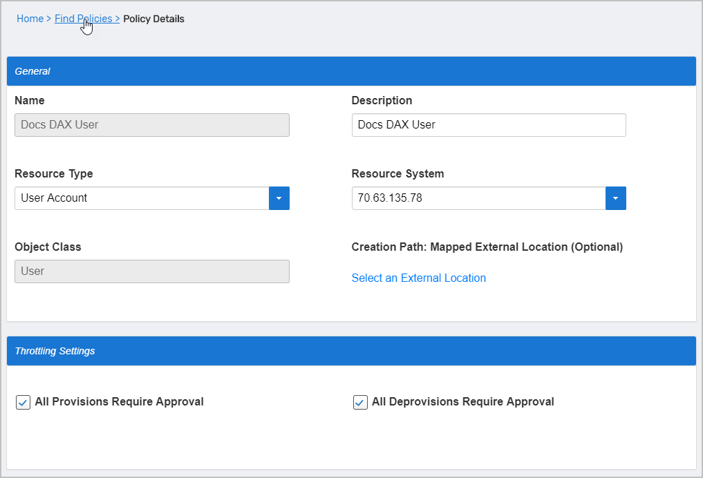 - All Deprovisions Require Approval – If this option is selected, the deprovisioning of each RET specified by the policy will need to be approved by a user delegated access to the Resource Entitlement Inbox.