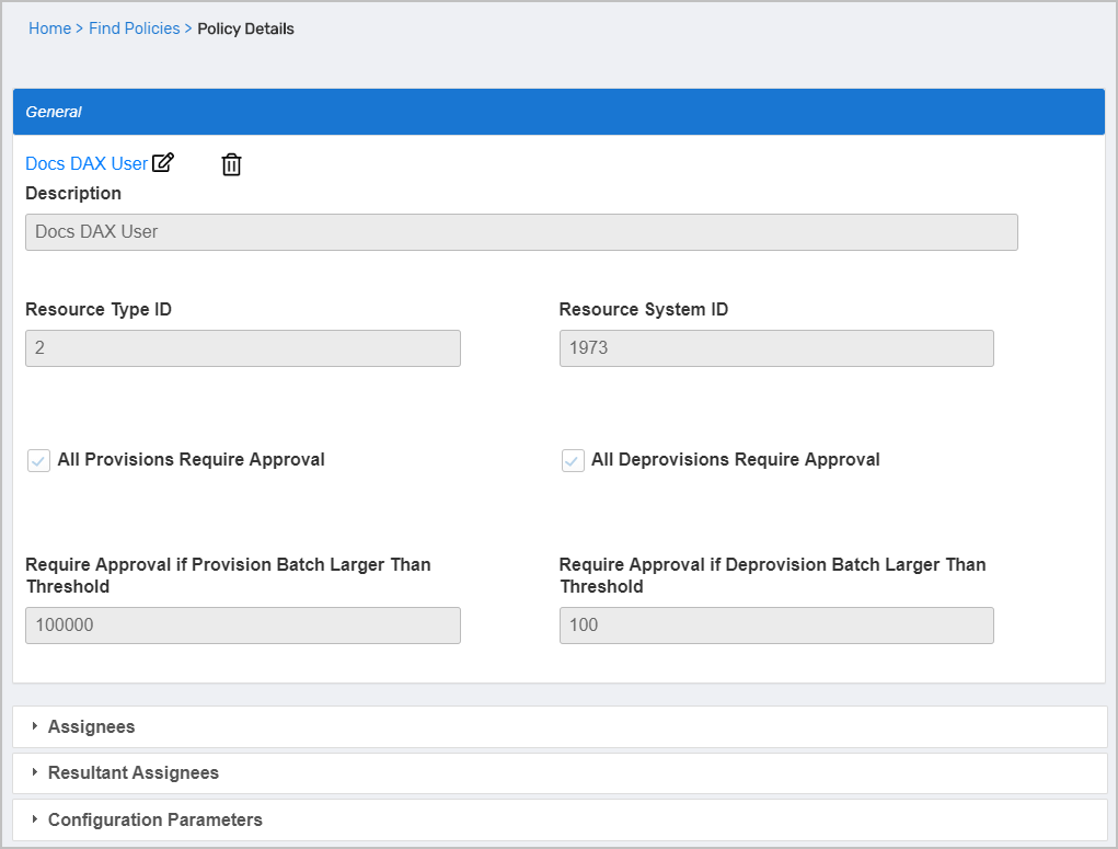 On the View page, click the Assignees accordion to expand it. This accordion allows you to assign the policy to any or the following EmpowerID actor types: