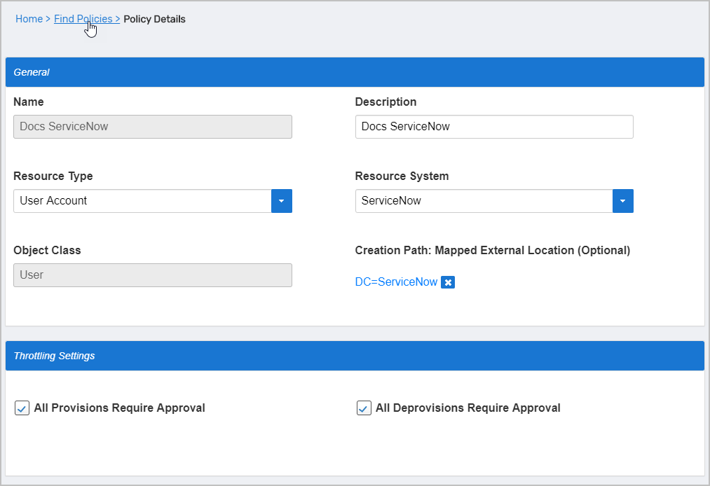 - On the Policy Details page, click the Find Policies breadcrumb.