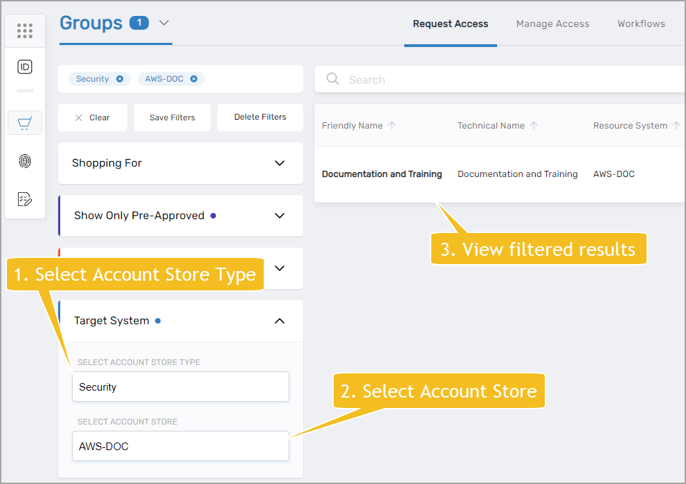 - Select Account Store allows users to filter groups to display only those belonging to the selected Account Store. To be a filter option, Account Stores must have the Is Visible in IAM Shop property set to true. The filter is used in conjunction with the selected Account Store Type filter to display groups belonging to the selected account store. Groups existing in other account stores are excluded. |