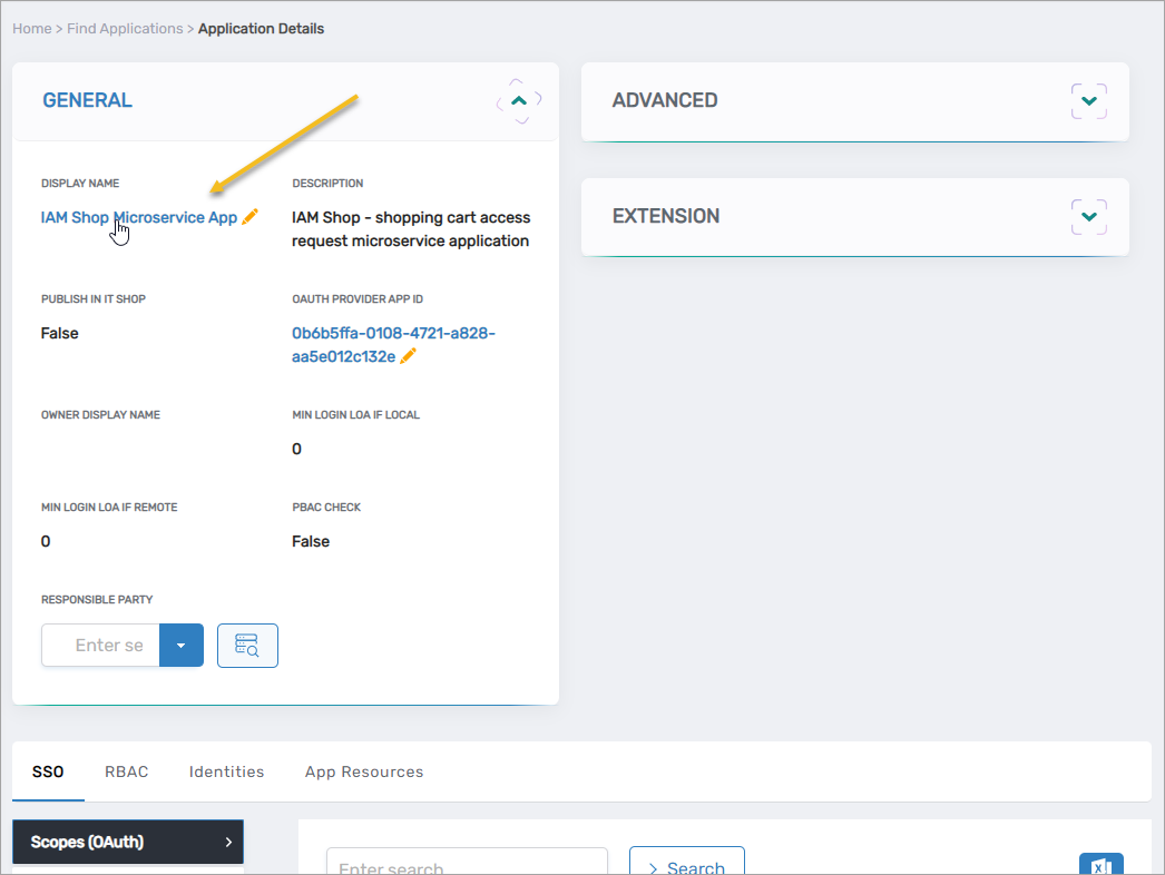 - Click the Display Name link on the View One page for the application to put the app in Edit mode.