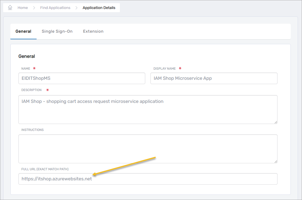 - On the General tab, locate the Full URL (Exact Match Path) field and enter the URL for the microservice in your environment.