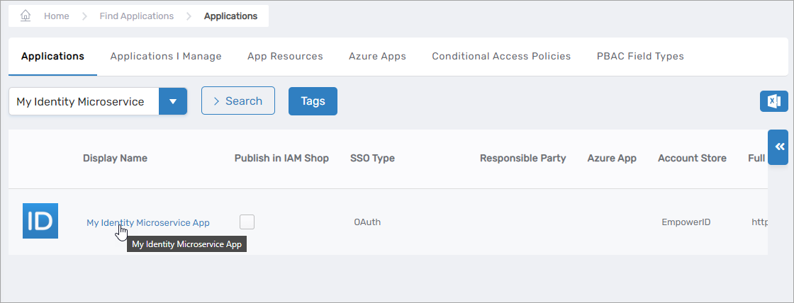 - Select the Applications tab and search for My Identity Microservice App.