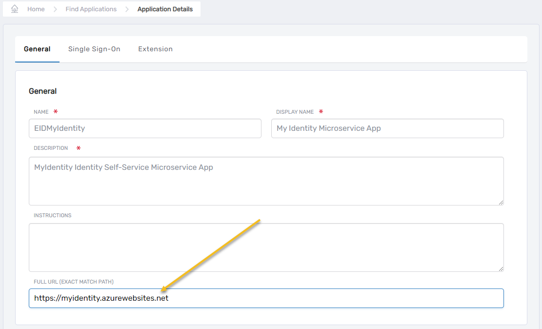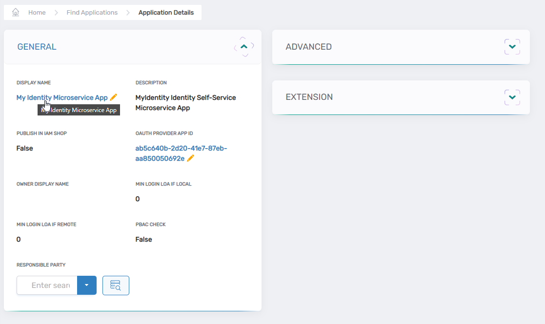 - On the Application Details view, click the Display Name link to put the app in Edit mode.