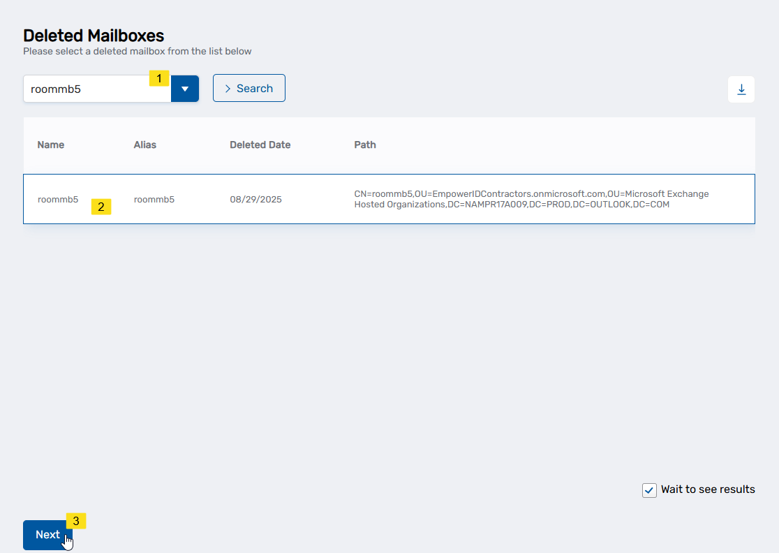 - In the Deleted Mailboxes lookup that appears, search for the deleted mailbox you want to restore, click the record for it to select it and then click Next.