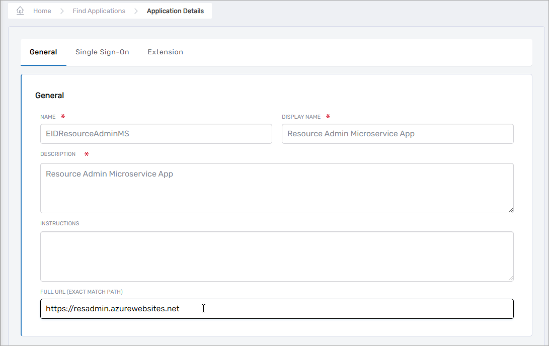 - On the General tab, locate the Full URL (Exact Match Path) field and enter the URL for the microservice in your environment.