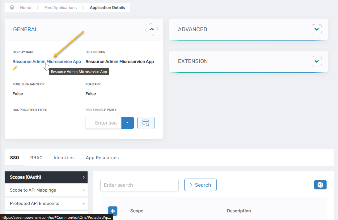 - Click the Display Name link on the View page to put the app in Edit mode.