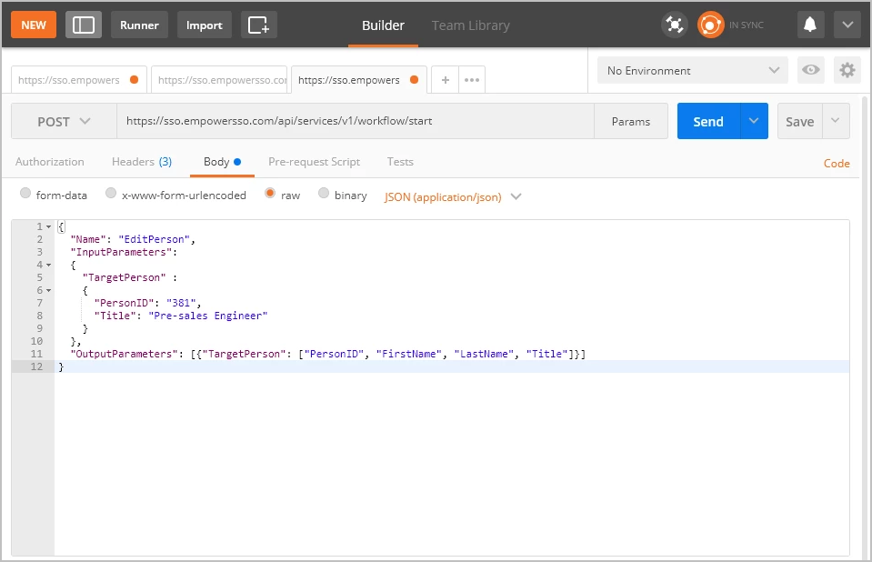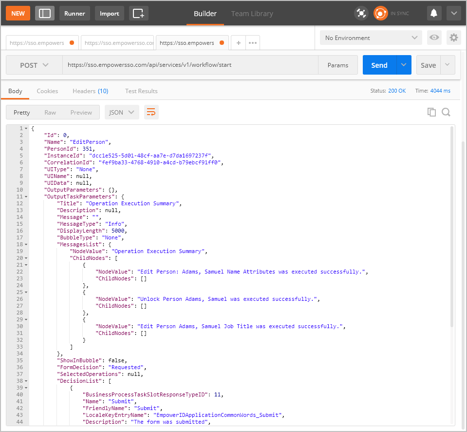 To call the API so that it performs the operations or returns the data requested by your application, you need to make a POST request to the appropriate endpoint. When creating new resources like an EmpowerID Person, you need to POST a request to the endpoint that starts the EmpowerID Workflow service, passing to the API the necessary header and request data. For editing people, this data is as follows.