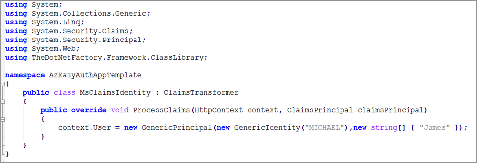 EmpowerID.AzEasyAuth.HttpModule.dll. - Add a class (i.e., MsClaimsIdentity) that derives from the